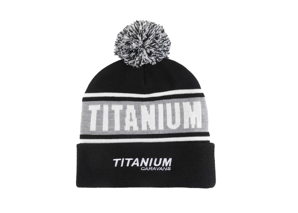 Warm knitted acrylic beanie with a roll up cuff, trendy stripes and a pom-pom. It is available in one size which will fit most people.